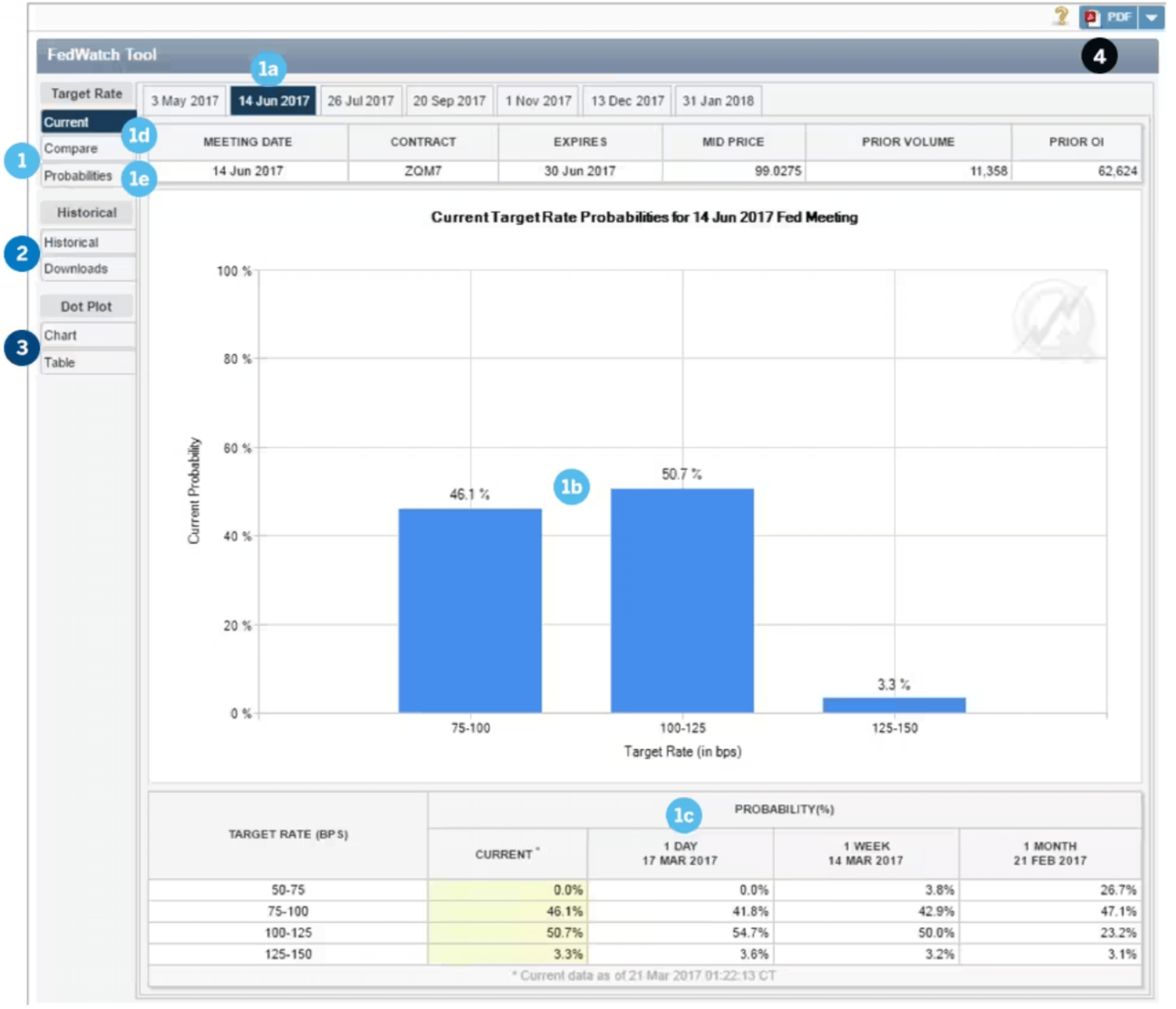 1b:在芝商所FedWatch工具的顶部选择会议日期后,将在“当前”标签中显示与这天各种目标利率结果可能性有关的数据。 这些可能性数据是基于与会议日期对应的联邦基金期货合约交易活动而得出。
