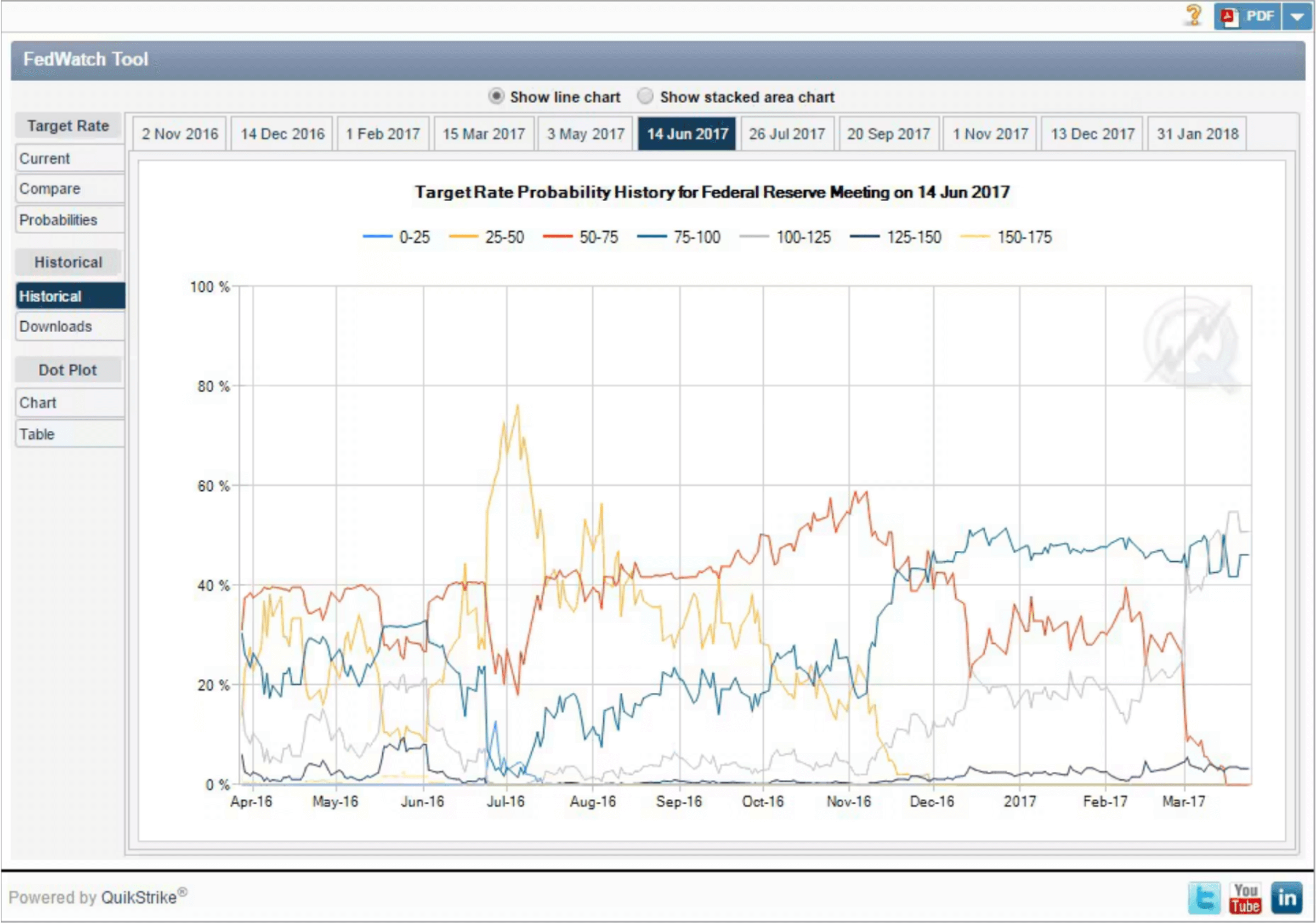 工具左边的栏框标为“历史”,显示的是所选会议日期各目标利率结果的历史可能性,数据可回溯一整年。在本栏的“下载”部分,可下载所有会议日期原始的历史可能性数据。