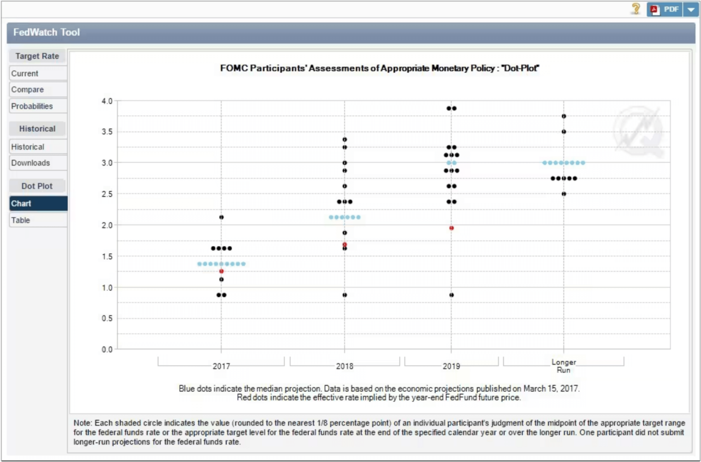 一直以来,美联储的“点阵图”反映的是FOMC成员随时间推移对美联储目标利率的预测,可在芝商所FedWatch工具的图表中使用。每个点代表一位FOMC成员对给定年份目标利率的预测,红点除外,它们代表这一年年底联邦基金期货价格隐含的目标利率。蓝点代表FOMC成员的预测中值。这些数据也可在“表格”标签中的表格中查看。