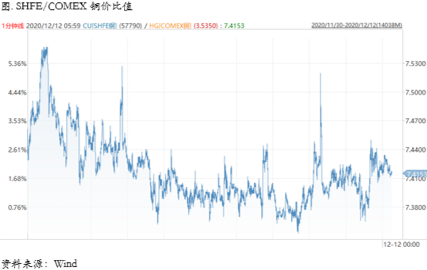 上周铜价维持强势格局,周一铜价震荡回落,日间时段中国11月出口数据大超预期,同比升值21%的高位水平,但是风险资产对此反映平静,无论是权益市场,还是对出口比较敏感的铜价,在数据公布后反而以震荡偏弱为主,这是标准的利多出尽的状态,可能市场预期出口见到了阶段性高点;晚间时段受疫苗进度的提振,铜价有所反弹;周二铜价震荡偏弱,日间时段市场情绪较为risk off,铜价震荡走弱,晚间时段一方面努钦想佩洛西提出了新的9160亿美元的刺激计划,再次给市场希望,另一方面FDA证实辉瑞的疫苗健康且安全,市场情绪得到提升,权益市场创下新高,铜价收复日内跌幅;周三铜价冲高回落,整体依然维持宽幅震荡格局,日间时段中国公布了11月CPI与PPI数据,整体表现符合市场预期,铜价并未受太大影响,下午中国公布了11月信贷数据,仍然基本符合预期,但是市场可能更多认为年内信贷脉冲的高点已经见到,因此表现相对平静,晚间时段美国刺激计划再度搁浅,市场风险偏好回落,美股显著回调,铜价承压回落;周四铜价大幅反弹,日间时段铜价表现较为平静,以震荡走势为主,晚间时段,欧洲央行维持利率不变,且释放了更加宽松的资产购债计划,同时拉加德还呼吁更多的财政和货币支持,而同时美国初请失业金意外激增,导致欧元上涨、美元下跌,加之市场情绪亢奋,推升铜价大幅上行;周五铜价未能延续周四的涨势,市场风险偏好有所降温,铜价承压回落。