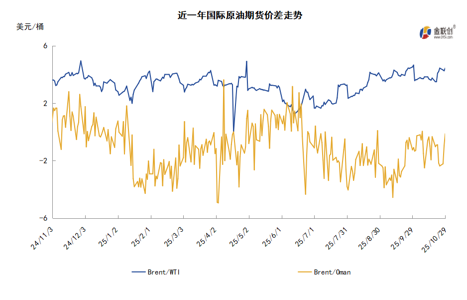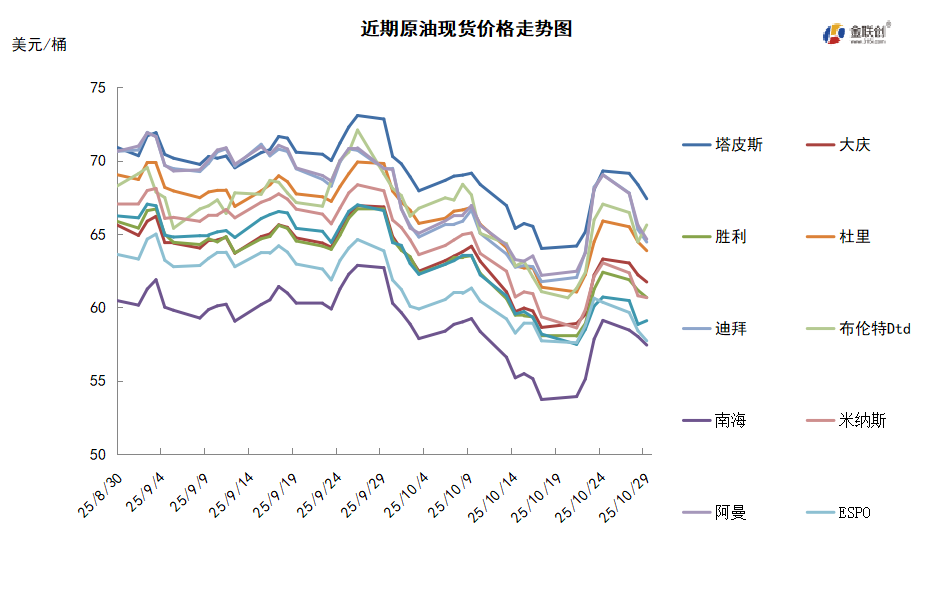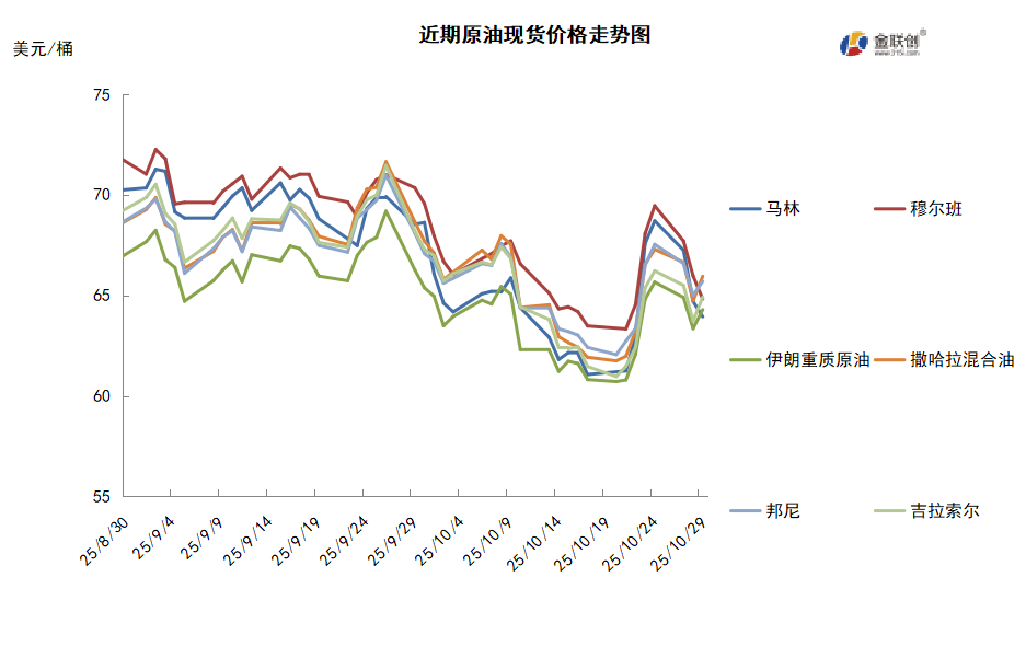 本周,国际原油现货均价环比上涨。中东原油市场方面,装船计划显示,伊拉克11月份经由土耳其杰伊汉港的基尔库克原油出口量将为25万桶/日,较10月的13.5万桶/日大幅增长86%。11月份出口计划将包括12船,是10月份6船船货的两倍。基尔库克输油管道于9月下旬重启向杰伊汉港的石油输送,10月份首次实现了石油出口,此前该管道已中断输油达两年半之久。亚太原油现货市场,消息人士称,印度石油公司(IOC)已经发布了一份石油供应的招标,同时印度信实工业有限公司则提高了从现货市场的采购量。根据28日发布的招标文件,印度芒格洛尔石化炼制有限公司(MRPL)也打算求购100万至200万桶原油。知情人士称,另一家国有炼油商印度巴拉特石油公司也计划在7-10天内发出现货标书,购买12月装运的原油船货以替代俄罗斯石油。该消息人士补充称,该公司只会从非制裁实体购买俄罗斯石油。此外,越南PV Oil公司已将Chim Sao和黑狮子原油的销售标书决标给了新加坡PV Oil公司,后来新加坡PV Oil公司在市场中转售了这些船货,其中泰国的Bangchack公司购买了12月装Chim Sao原油船货。与此同时,12月装黑狮子原油船货的成交价为即期布伦特升水逾1.00美元/桶,但买主身份不明。另外,新加坡PV Oil公司赢得了2026年黑狮子原油的定期销售标书,中标价为即期布伦特升水逾2.00美元/桶。
