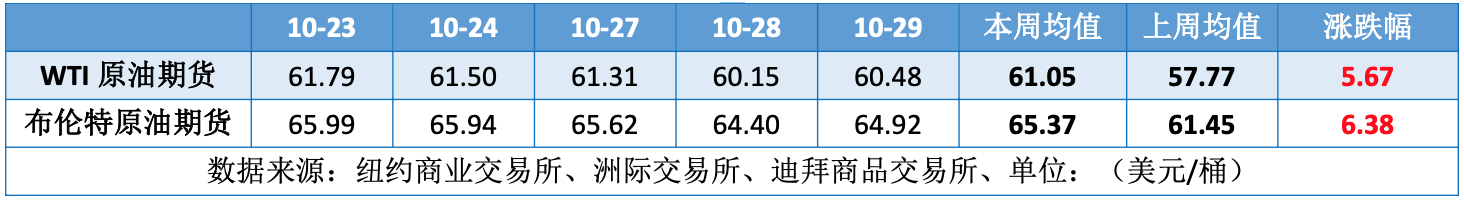 本周(10.23-10.29),原油整体呈现先扬后抑的走势,周均价环比上涨。