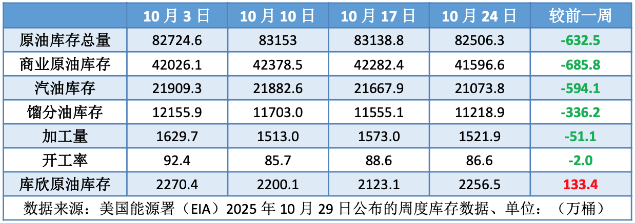 周内市场消息喜忧参半,美国实施对俄制裁,投资者对俄油供应前景的担忧提振油价上涨。美国财政部发表声明称,因俄罗斯缺乏结束俄乌冲突的诚意,美国决定对俄罗斯石油公司(Rosneft)和卢克石油公司(Lukoil)实施制裁。美国方面表示,此次制裁主要意图就是向俄罗斯总统普京施压,要求其结束乌克兰战争。市场机构统计数据显示,遭受制裁的两家俄罗斯公司目前合计约占全球石油产量的5%以上。此外,美国原油与成品油库存的减少也对油价起到支撑作用。美国能源信息署(EIA)数据显示,截至10月24日当周,包括战略储备在内的美国原油库存总量较一周前减少632.5万桶至8.25063亿桶,美国商业原油库存量较一周前减少685.8万桶至4.15966亿桶,美国汽油库存总量较一周前减少594.1万桶至2.10738亿桶,馏分油库存量较一周前减少336.2万桶至1.12189亿桶。