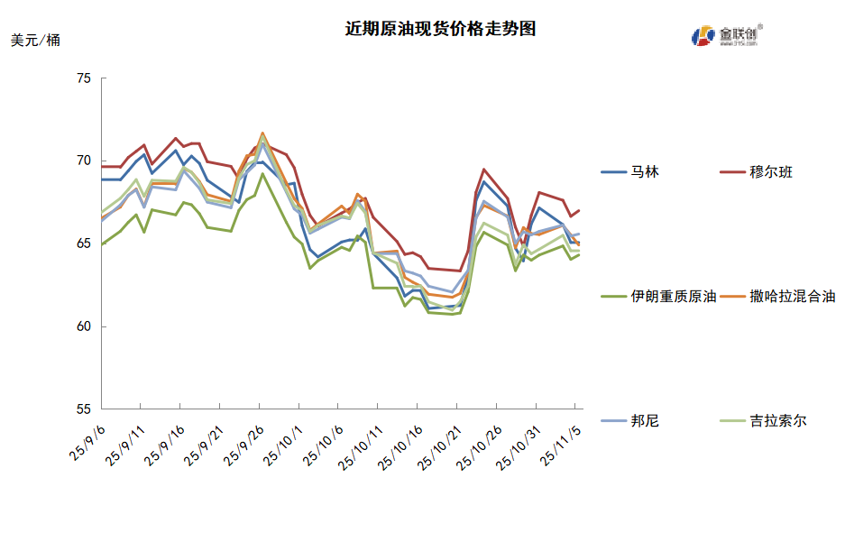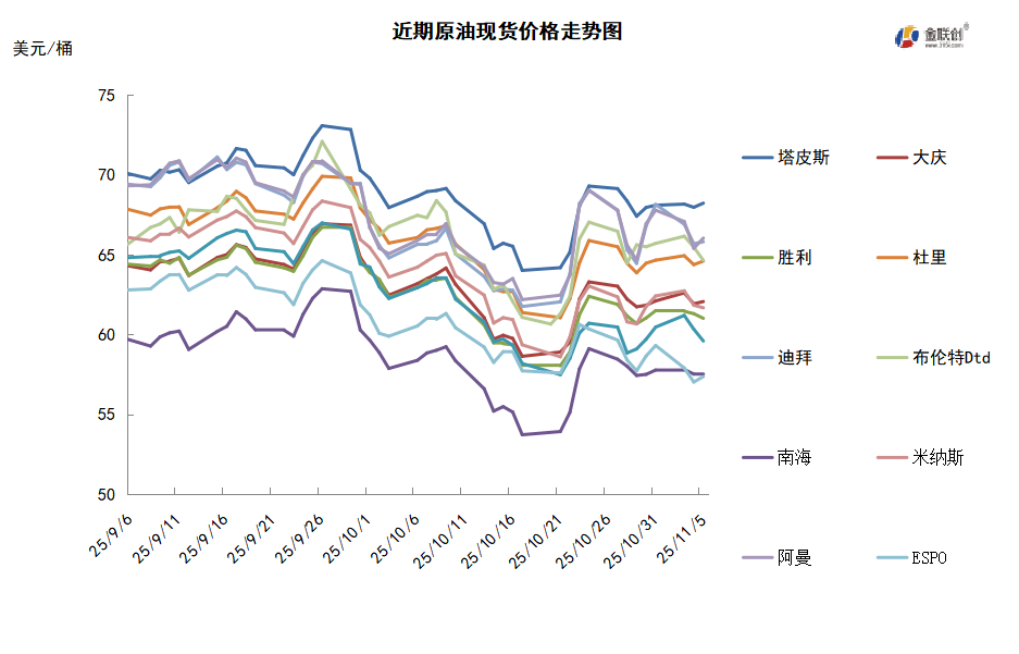本周,国际原油现货均价环比涨跌不一。中东原油市场方面,1月装穆尔班原油的现货价差小幅攀升,INPEX以每桶对官方售价升水0.06-0.09美元的价格销售了1月装穆尔班原油给欧洲摩科瑞公司。此外,1月装上扎库姆原油的现货价差小幅下跌,因为中质/重质原油供应和需求基本面前景仍宽松。1月装Das原油的现货价差也小幅下行,托克公司以每桶对官方售价贴水0.05美元的价格报价销售50万桶1月装Das原油,但是买家对此报价反应冷淡。亚太原油现货市场,交易商继续关注印度对俄罗斯替代原油的现货采购情况,因为需求信号支撑着中东原油市场。贸易消息人士表示,印度巴拉特石油公司已经通过现货招标从阿布扎比购买了200万桶12月装上扎库姆原油船货,以取代从俄罗斯进口的原油。此前,美国对两家俄罗斯主要石油生产商实施了制裁。其中一位消息人士称,卖家为ADNOC Trading公司。美国此前对俄罗斯两大油企Rosneft公司和卢克石油公司实施制裁,以此向俄罗斯总统普京施压,要求其结束在乌克兰的战争。BPCL公司一位消息人士表示,公司只会从非制裁实体购买俄罗斯原油。BPCL公司每个月从现货市场购买200万吨(1466万桶)原油,其中大部分来自俄罗斯。消息人士表示,对于其中的半数供应,BPCL公司希望继续从非制裁实体购买俄罗斯原油,其余半数将从现货市场购买非俄罗斯原油。招标方面,越南PV Oil公司发布标书出售总共120万-160万桶2026年1月至12月装Hai Thach凝析油船货,该标书将于11月4日截标,有效期直至11月19日。