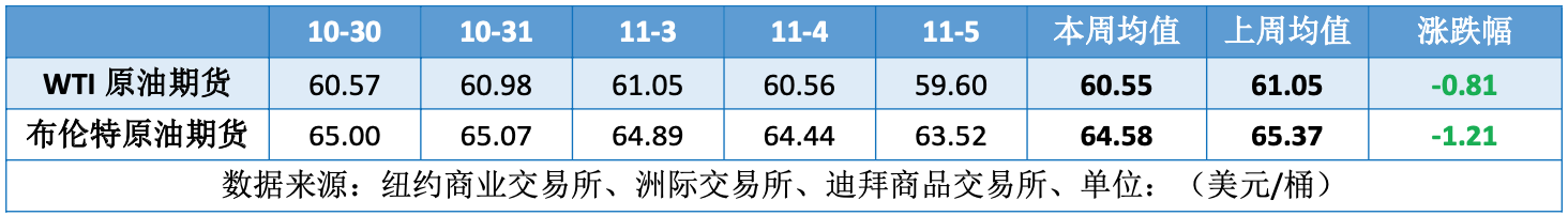 本周(10.30-11.5),原油整体呈现区间震荡的走势,周均价环比下跌。