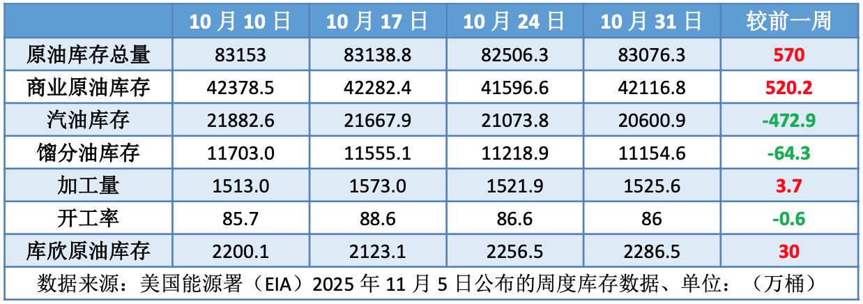 库存方面,美国原油库存超市场预期增加也导致油价承压。美国能源信息署(EIA)数据显示,截至10月31日当周,包括战略储备在内的美国原油库存总量较一周前增加570万桶至8.30763亿桶,美国商业原油库存量较一周前增加520万桶至4.21168亿桶。