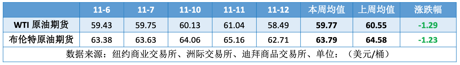 本周(11.6-11.12),原油整体呈现先扬后抑的走势,周均价环比下跌。