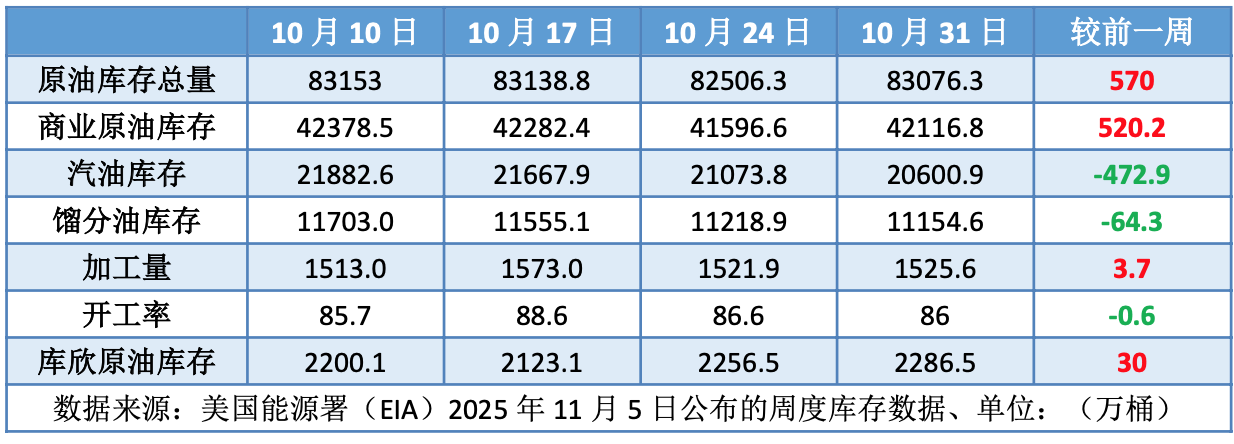 上周美国原油净进口量增加600万桶,美国原油库存意外增长,汽油和馏分油库存下降。美国能源信息署数据显示,截止10月31日当周,原油库存比去年同期低1.52%;比过去五年同期低4%;汽油库存比去年同期低2.49%;比过去五年同期低5%;馏分油库存比去年同期低3.68%,比过去五年同期低9%。上周美国原油进口量平均每天592.4万桶,比前一周增长87.3万桶,成品油日均进口量170.1桶,比前一周增长6.1万桶。