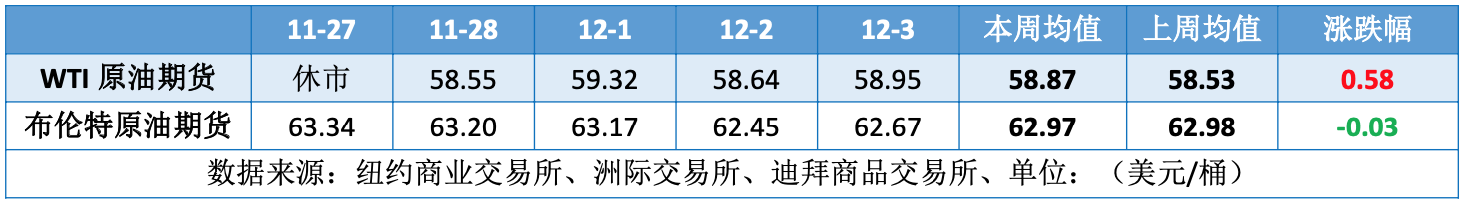 本周(11.27-12.3),原油整体呈现区间震荡的走势,周度均价环比涨跌不一。