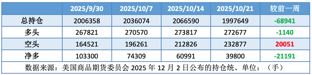 投机商在纽约商品交易所轻质原油期货中持有的净多头减少34.7%。美国商品期货管理委员会最新统计,截止10月21日当周,纽约商品交易所原油期货中持仓量1997649手,减少68941手。大型投机商在纽约商品交易所原油期货中持有净多头39800手,比前一周减少21191手。其中持有多头272677手,比前一周减少1140手;持有空头232877手,增加20051手。