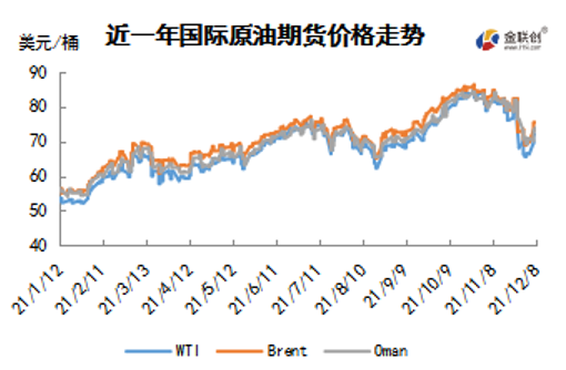 本周(12.2-12.8),WTI均价69.33元/桶,较前周上涨1.87美元/桶,涨幅2.77%。在经历前周暴跌后,投资者正重新评估原油市场,奥密克戎病毒影响不及预期,需求担忧持续缓解提振油价在本周大幅反弹。此外,美伊核谈再陷僵局,EIA原油库存下降,OPEC各国对需求的乐观预期等利好因素也支撑原油。