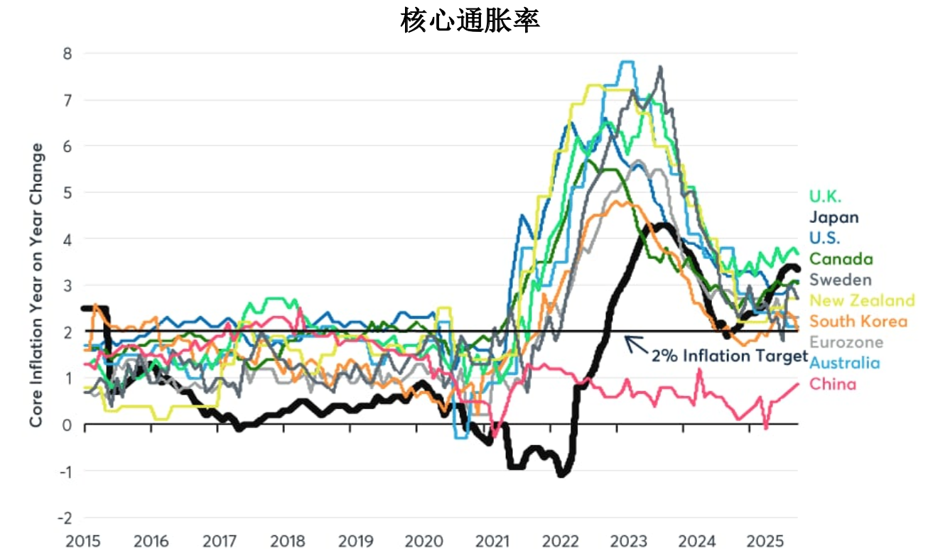 大部分国家央行的通胀目标水平都定在2%。然而,除了中国和瑞士外,几乎每个主要经济体的核心通胀率都高于目标水平。此外,几乎所有国家的核心通胀率都已停止下降,而在包括美国、英国和日本在内的许多国家,核心通胀率已开始再度上升(图2)。