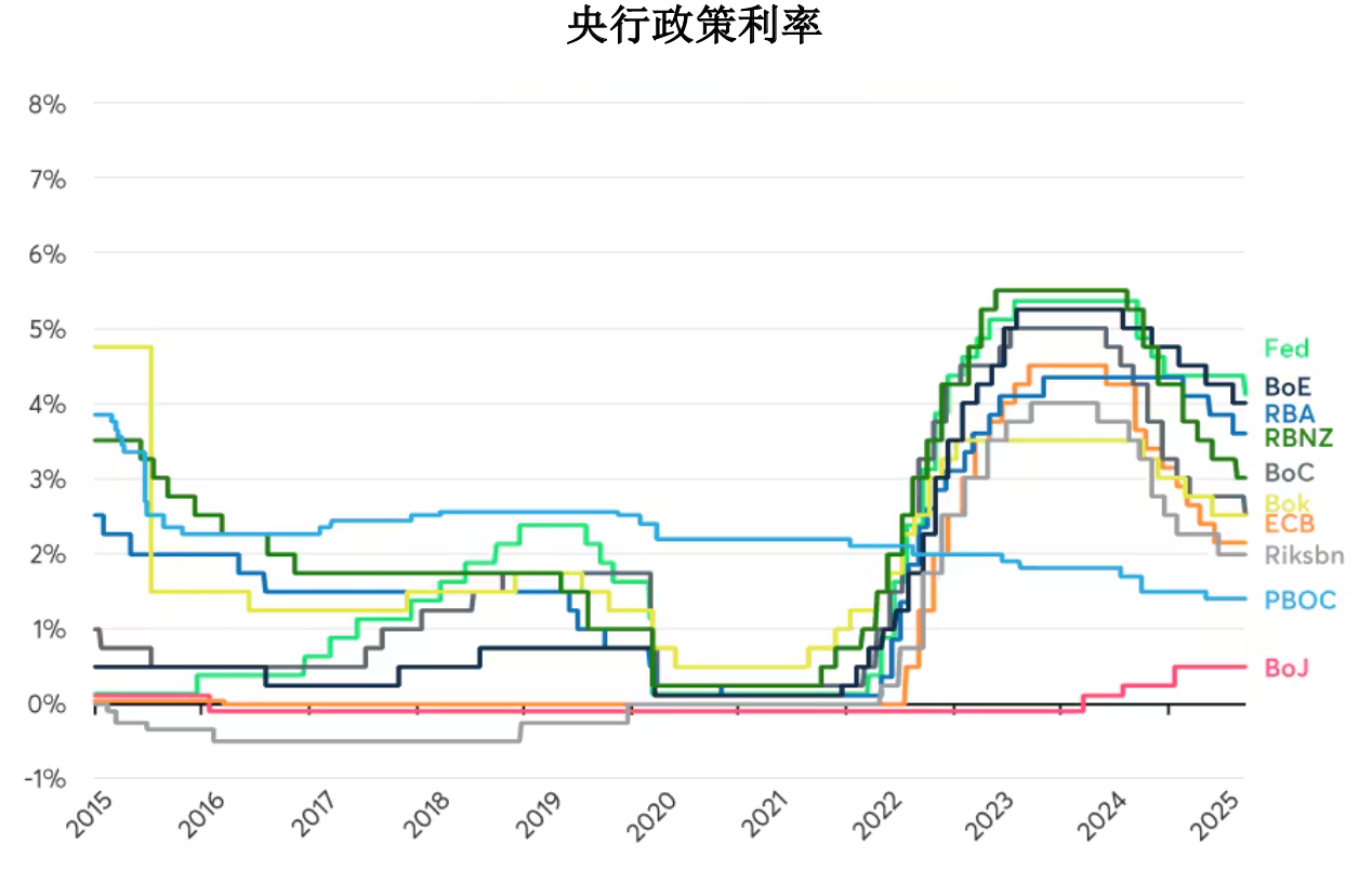 资料来源:彭博专业服务(FDTRMID、CBAROVER、UKBRBASE、EURR002W、BOJDPBAL、RBATCTR、PBOC7P、SWRATEI、KORP7DR、NZOCR)