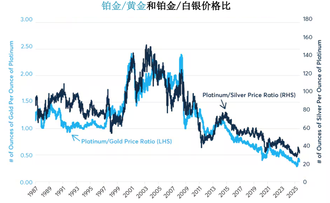 铂金价格正在经历自2009年至2011年以来的最大涨势,并且在2025年的表现不时优于黄金和白银。不过,如果查看铂金/黄金和铂金/白银的价格比则会发现,铂金价格自2011年以来低于黄金价格,而自2003年以来低于白银价格(图4)。这种价格比计量的是一盎司铂金可以购买多少盎司的黄金或白银。