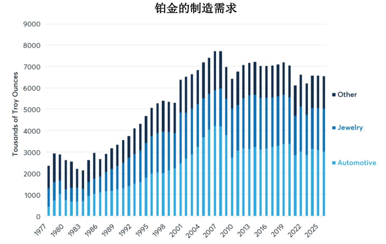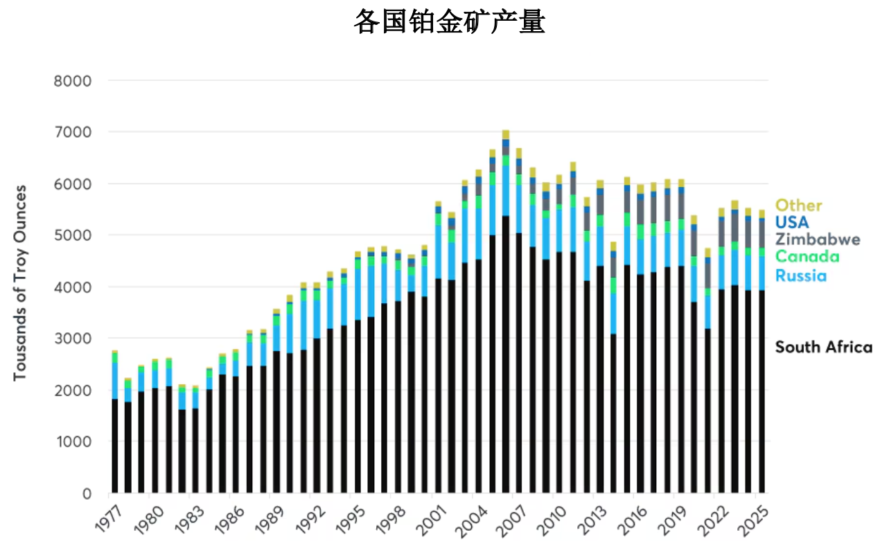 在2025年之前,铂金的供给量小且在持续下降,并不足以支撑价格上涨,这主要是因为汽车行业对铂金的使用在减少。尽管如此,从历史上看,铂金相对于黄金和白银价格较低,随着它在汽车行业中的使用趋于稳定,投资者可能会注意到它的供应基础的高度集中。