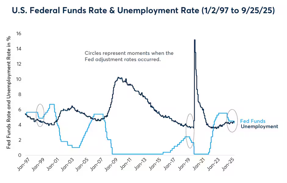图5中的黑色虚线圆圈标注了美联储调整降息发生的时刻,以及接下来几个月联邦基金利率和失业率的变化。