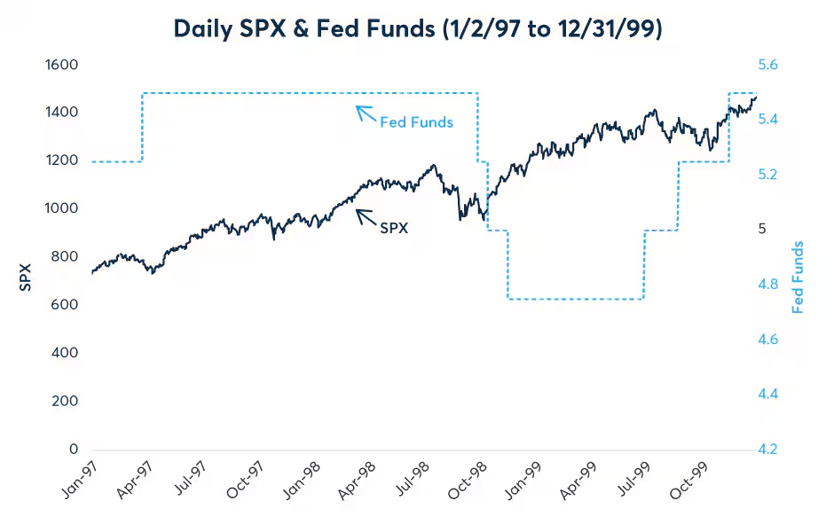 从1997年3月25日到1998年9月29日的联邦公开市场委员会(FOMC)会议期间,联邦基金利率保持在5.5%。在那次会议上,时任美联储主席艾伦·格林斯潘因俄罗斯违约危机将联邦基金利率下调25个基点,从5.5%降至5.25%,以“缓解外国经济体日益疲软和国内金融环境收紧对美国未来经济增长的影响。”随后,在1998年10月15日(发生在FOMC会议之间)和1998年11月17日再次进行了两次25个基点的降息,联邦基金利率降至4.75%。