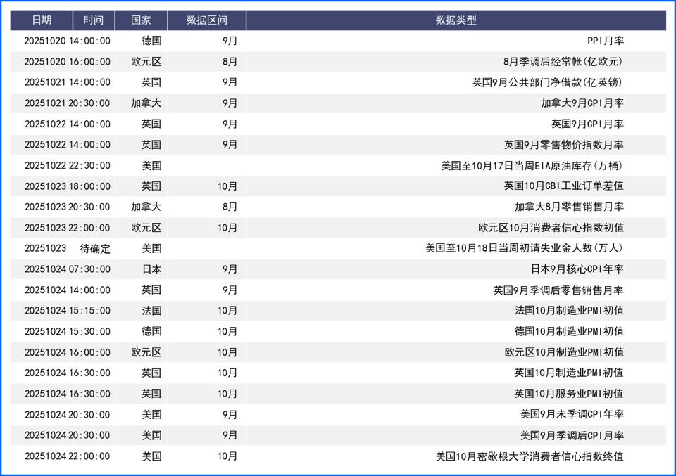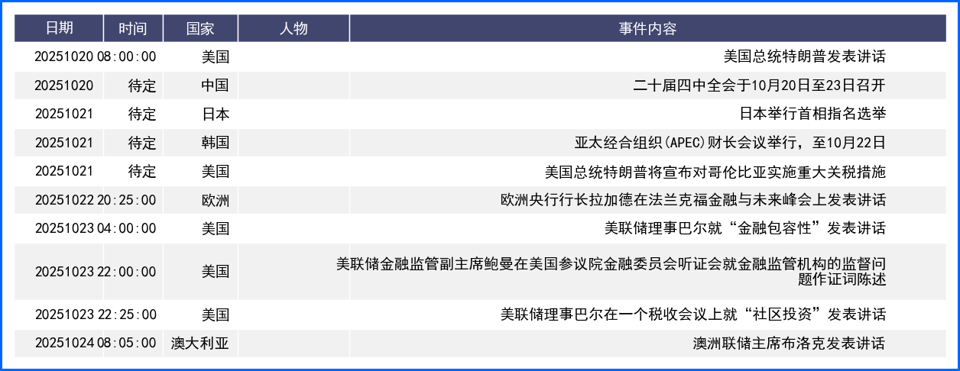 回顾上周,美元指数经历回落一周,鸽派降息预期受到官员公开发言影响持续对美元施压。非美货币方面,主要跟随美元回落而上行,其中日本和欧洲基本面方面均有较鹰派事件支撑日元。展望本周,尽管美国政府停摆导致部分数据仍存缺位风险,但仍有多组全球重磅经济数据及密集央行官员讲话将公布,同时也将有G30会议、APEC财长会集中亮相。