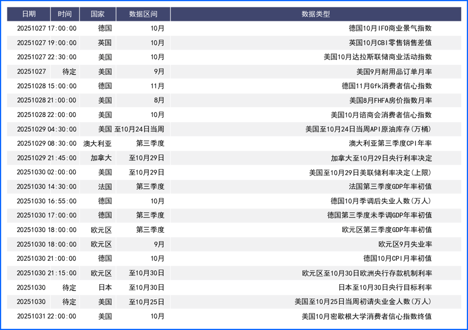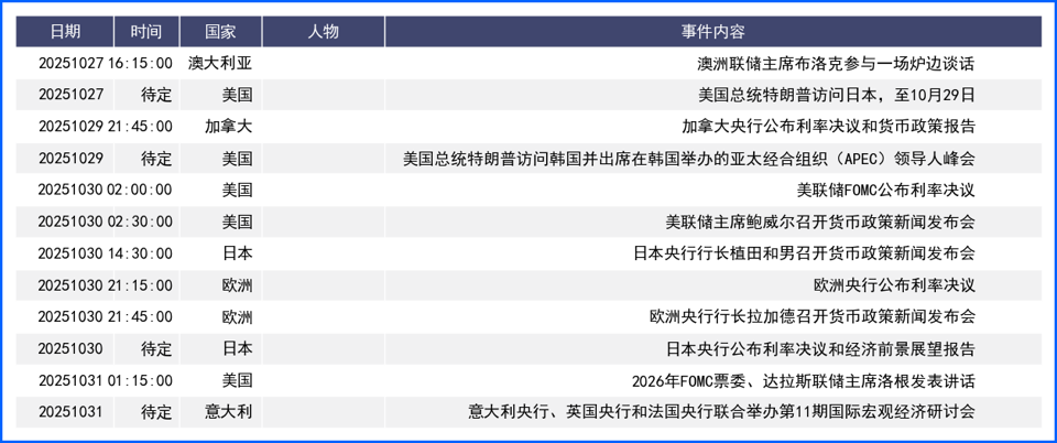 回顾上周,美元指数和大部分非美货币均维持窄幅震荡,展现出在本周美联储利率决议公布前的交投谨慎氛围。展望本周,美联储、欧央行、日央行同日公布利率决议,APEC峰会聚焦亚太合作新路径。与此同时,美国政府停摆导致的核心通胀数据发布悬念,数据真空与政策博弈的交织很可能加大市场波动。值得投资者重点关注。