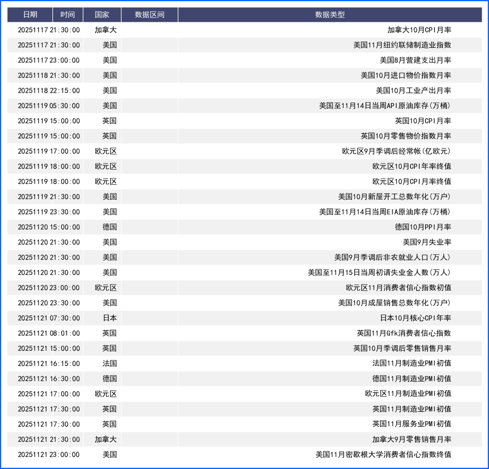 经济基本面的双重压力让美联储政策陷入两难,也左右着美元走势。短期来看,通胀粘性带来的鹰派政策预期仍在支撑美元,11月17日美元指数微涨0.08%至99.35附近。但中期而言,美元走势将取决于通胀韧性与经济放缓的力量博弈,政府停摆期间的信息空白亟待填补。未来一个月陆续发布的就业、零售额等延期报告,将为判断美国经济走向、美联储政策动向及美元后续走势提供关键依据,市场需密切关注数据变化带来的预期调整。