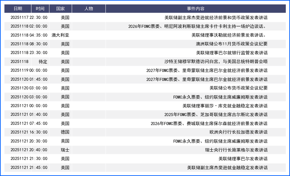 回顾上周,美元指数经历高位回落一周。尽管美国政府本周刚结束停摆闹剧,但短期内美国市场面临较严重流动性危机,对美元继续施压。核心症结在于国库券发行量引发短期市场资金外流,银行体系内准备金规模被动出现收缩。展望本周,全球市场将迎密集数据与重磅事件轰炸。从多国GDP、通胀数据到美联储政策纪要,从美联储官员扎堆讲话到多国央行利率决策,宏观经济基本面信号、政策转向、行业景气度等事件或数据,均可能引发市场剧烈波动,投资者需保持关注,甚至可考虑提前布局。