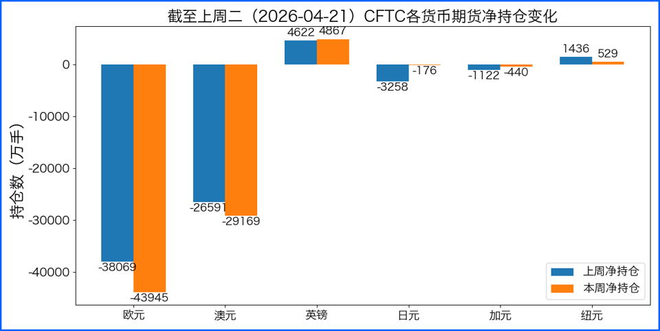 据美国商品期货委员会公布的2026-04-21期货市场头寸持仓报告显示,上周各货币的报告总持仓情况如下:欧元净空头变化5876手,澳元净空头变化2578手,英镑净多头变化245手,日元净多头变化3082手,加元净多头变化682手,纽元净空头变化907手,上周没有总持仓多空转换的货币。没有单向总持仓变动超过20%的货币。