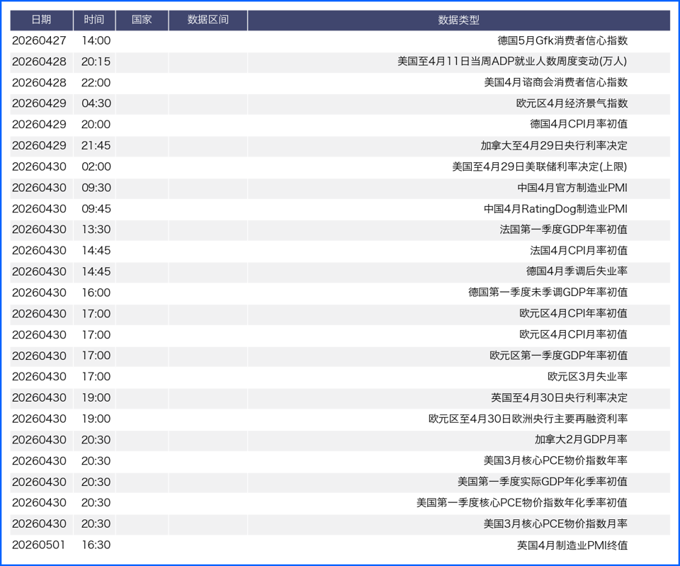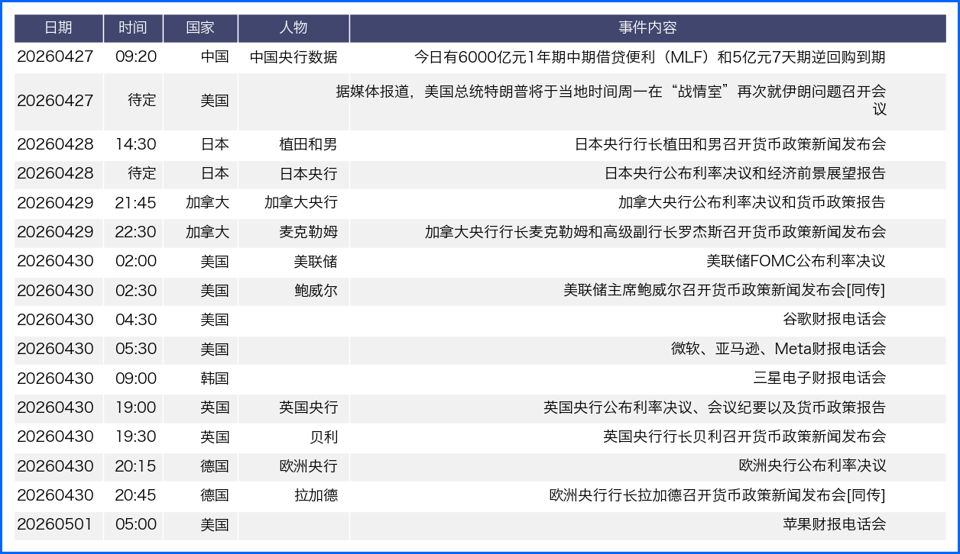 回顾上周,美元指数维持窄幅震荡,非美货币走势相对独立各有涨跌,其中欧元和日元相对走势较弱。除此之外,周末在华盛顿希尔顿酒店的白宫记者协会年度晚宴,出现了一男子携带多件武器试图闯入会场,并与安保人员发生交火后被制服的风险事件,现场一度陷入混乱,美国总统随后被紧急护送离开,短期内或可能推高金融市场波动率。展望本周,欧洲、英国、美国均有大量重要经济数据公布、同时包括日本央行、美联储、欧洲央行、英国央行等均将公布利率决议,本周汇价势必受到相关经济事件的较大冲击,值得重点关注。