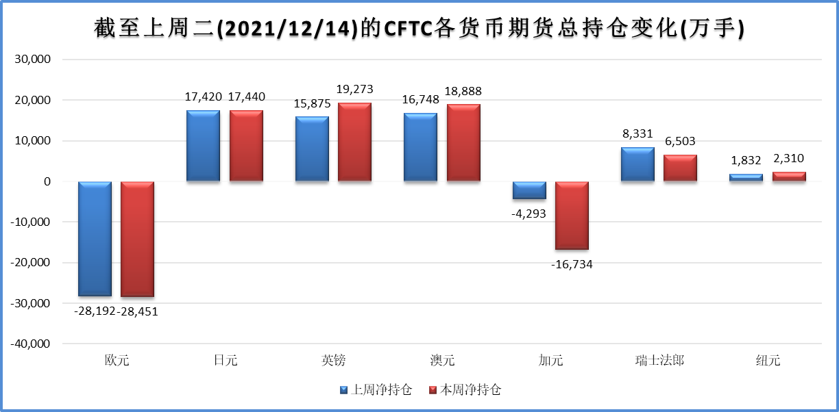 据美国商品期货委员会公布的2021-12-14期货市场头寸持仓报告显示,上周各货币的报告总持仓情况如下:欧元净空头变化259手,澳元净多头变化2140手,英镑净多头变化3398手,日元净多头变化20手,加元净空头变化12441手,纽元净多头变化478手,上周没有总持仓多空转换的货币。除此之外,单向总持仓变动超过20%的货币有:英镑,加元,纽元。