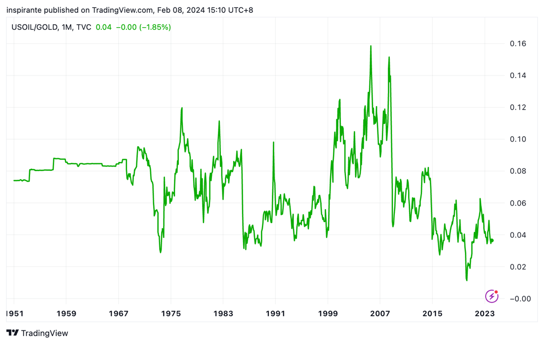 通过道琼斯工业平均指数与黄金的比率,我们可以观察过去几十年间购买每单位