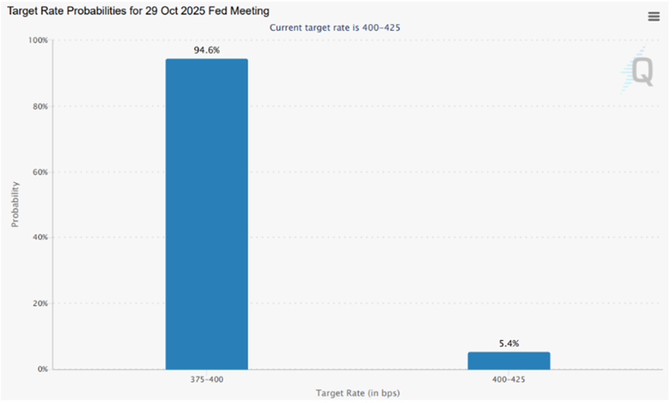 不过根据芝商所利率观察工具(FedWatch Tool)在10月8日的数据显示,预期美联储10月降息25个基点的累计概率为94.6%。