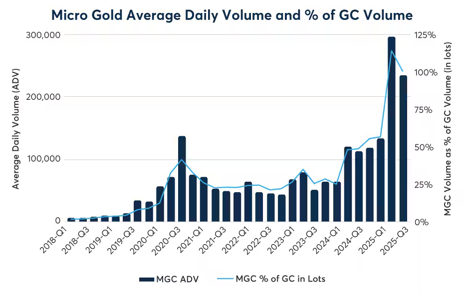 黄金作为投资品的吸引力也在不断提升。有数据显示,微型黄金期货(产品代码:MGC)的平均日交易量(ADV)为312,831份合约,创下历史第二高的月度记录,环比增长64.5%。这一强劲的交易数据,不仅体现了市场对黄金长期价值的认可,也反映出投资者正积极利用更小、更灵活的工具来管理和配置资产。