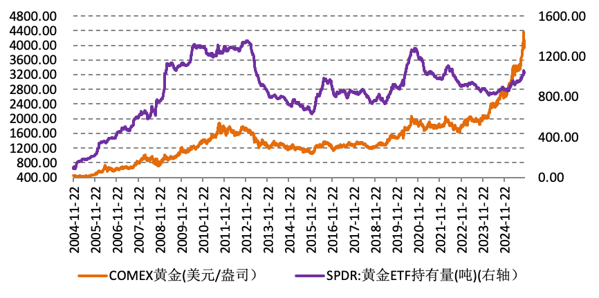 图1:全球最大的黄金ETF——SPDR持仓和黄金价格走势对比
