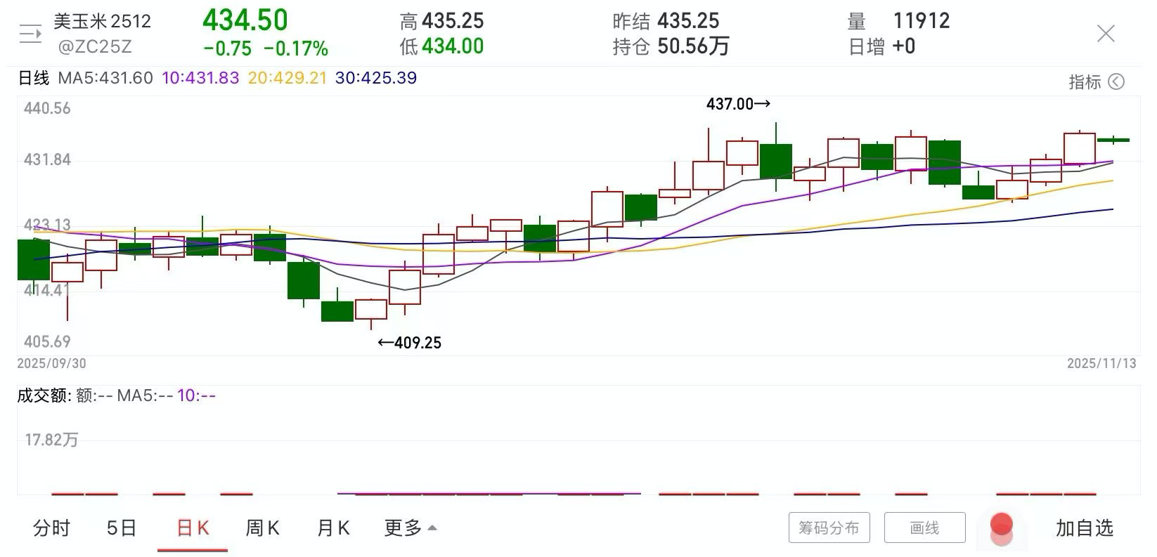 美玉米市场则呈现出一定的回调压力。CBOT玉米近月合约虽最近几日有所上涨,但若以11月以来的走势来看,呈现“V形”走势,上涨动力不够强劲。核心原因在于全球供应宽松叠加中美贸易缓和后中国暂未启动美玉米采购。