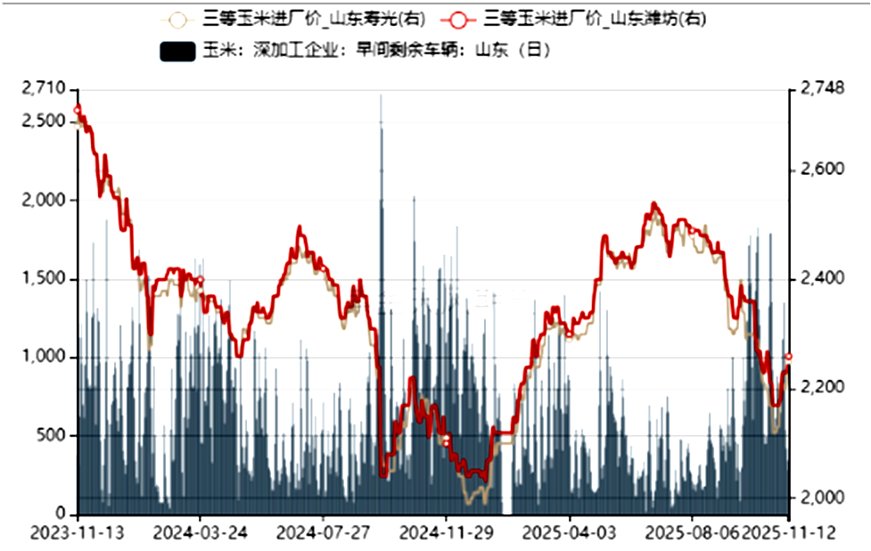 11月13日,山东深加工企业到车323辆,到车数量从11月初开始逐步减少。另外,储备入市收购也支撑玉米现货价格。
