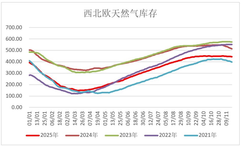 经历了2024/2025年冬季的大量消耗后,欧盟天然气储存在2025年春季处于较低水平。然而,夏季强劲的LNG进口支撑了快速补库,截至10月初,欧盟储气库的注气水平已达到83%,但依旧低于去年同期的93%。与此同时,10月欧洲LNG总进口量为942.4万吨,环比上月增加14.69%,同月增加36.94%。美国LNG是主要增量来源,部分替代了俄罗斯管道气的缺口。