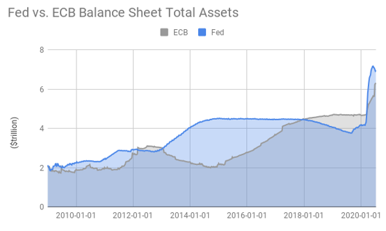 即将到来的欧盟刺激政策可能会对欧元产生负面影响,但可能最重要的影响因素还是欧洲中央银行(ECB)与其他国家中央银行资产负债表的规模相比已经很大。在7月16日的会议上维持基准利率不变后,欧洲央行恢复了每月200亿欧元的资产购买计划,并将根据当前计划将资产负债表上的规模总额再增加1.3万亿欧元。但自3月份市场触底以来,美联储最近首次收紧流动性。当美联储资产负债表规模跌破7万亿美元时,欧洲央行资产负债表规模跃升至6万亿美元以上。下图中显示,欧洲央行资产负债表的规模自2018年初首次超过美联储之后有望再度反超。