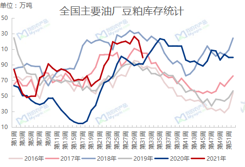 豆油方面,供需变化不大,行情较为被动。根据我的农产品网统计,截至2021年8月6日(第31周),全国重点地区豆油商业库存约96.47万吨,环比上周减少1.69万吨,降幅1.72%;全国重点地区棕榈油商业库存约34.36万吨,环比上周减少3.72万吨,减幅-9.76%;华东地区主要油厂菜油商业库存约35.4万吨,环比上周增加2万吨;两广加福建地区的菜油4.9万吨,环比上周减少0.7万吨。可见,油脂总库存下降,累库不理想。而需求方面,豆油表观消费量35万吨,为近三年平均水平。豆油供需维持偏紧、累库不理想的格局,豆油基差有望止降回升,我们看好后期的豆油基差、看好豆油的月间正套。单边方面,预计高位震荡,关注本周的MPOB供需报告和USDA 8月供需报告,市场对马棕产量和美豆的产量分歧或将得到指引。