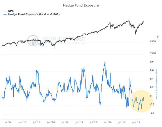 对冲基金在风险敞口方面比传统的基金经理更为灵活,从今年年初开始,它们实际上一直在做空股市。如下图所示,对冲基金在SPX上的敞口于2018年1月达到峰值,之后在当年上半年呈现负向扩大态势。但当SPX在7月触及新高时,对冲基金试图迎头赶上,并在下半年大幅回调之前上涨。由于对冲基金可能被迫再次亏本抛售股票头寸,即便美国股市迅速收复了今年的全部失地,它们仍保持着股票净空头头寸。