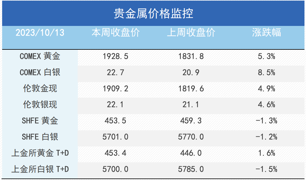 贵金属方面,上周COMEX黄金上涨5.35%,白银上涨5.19%;沪金2312合约下跌1%,沪银2312合约下跌1.06%。主要工业金属价格中,COMEX铜、沪铜分别变动-1.73%、-1.15%。