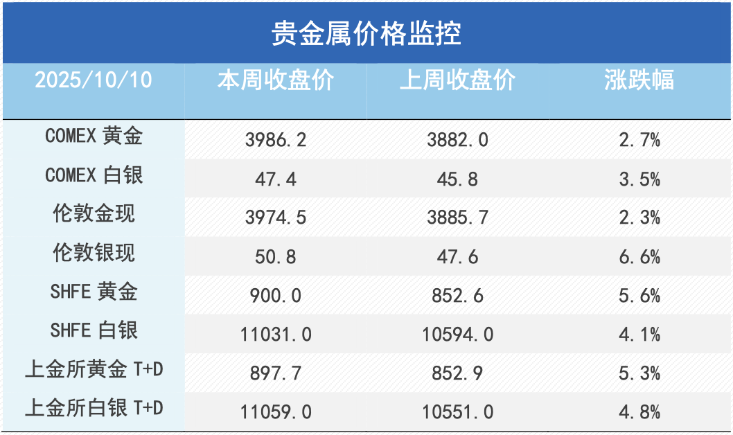 上周金银价格表现强势,COMEX金银于3909-4081美元/盎司、46.7-50美元/盎司区间内运行。上周,在美国政府停摆后美国经济数据被推迟公布,而降息预期主导下贵金属价格走强,同时海外白银挤仓逻辑使得银价创下新高,此后伴随地缘冲突放缓叠加美元走强,金价有所回调。周五,特朗普晚间发表言论似再度升级中美贸易冲突,避险情绪主导下金价再度回升。