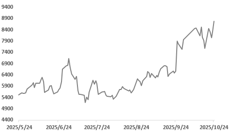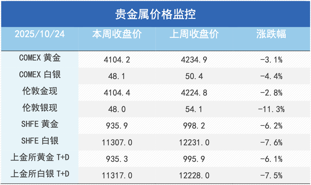 贵金属方面,上周COMEX黄金下跌3.3%,白银下跌4.38%;沪金2512合约下跌6.17%,沪银2512合约下跌7.49%。主要工业金属价格中,COMEX铜、沪铜分别变动+2.4%、+3.95%。