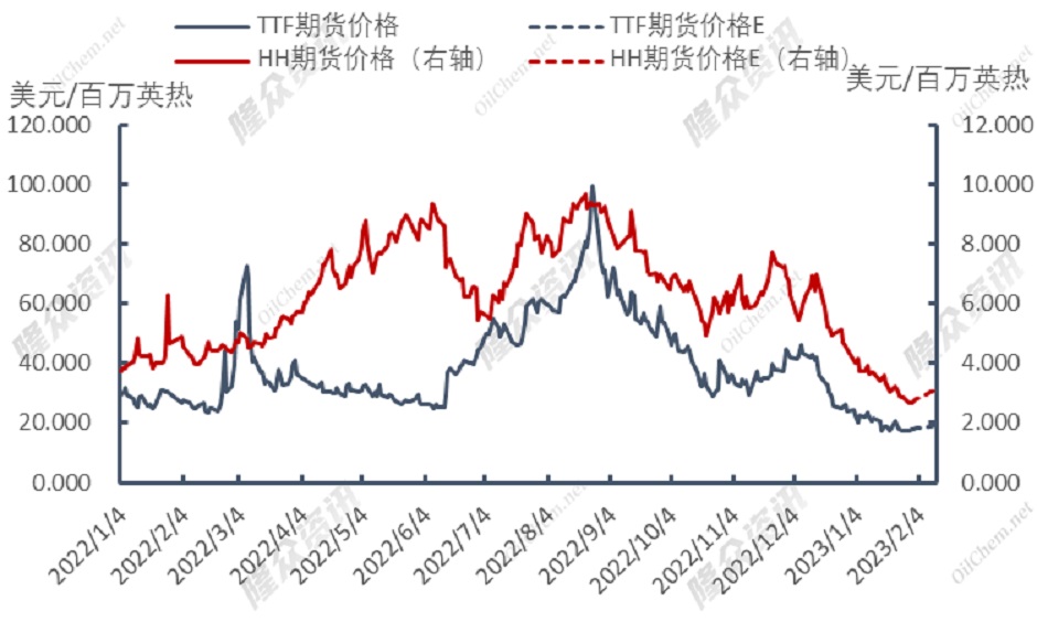 美国亨利港天然气(HH)预计现货价格震荡上行,美国国内气温保持低温,国内需求维持高位,且自由港(Freeport)复工进度进一步推进,中国春节假期后美国LNG出口供应有所增加,带动HH现货价格上涨。