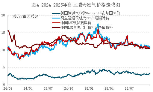 需求方面,西北欧气温逐渐下降,且期间巴黎曾出现明显降温过程,最高气温远低于历史同期平均水平,因此整体发电制冷需求减弱,其他商业和住宅需求较为稳定。综合来看,9月欧洲TTF价格整体低位震荡收跌,原因主要是受供需形势持续宽松影响。尽管挪威管道气一度进行大规模检修,且欧盟对俄实施新一轮制裁及美国敦促对购买俄原油的行为加征关税等地缘事件一度推升风险情绪,但是,美国LNG与俄管道气供应充足,确保了注库进程相对顺利,同时,可再生能源发电强劲及淡季需求低迷抑制了气价。因此,供需宽松基本面最终主导市场,压制价格转而下跌。