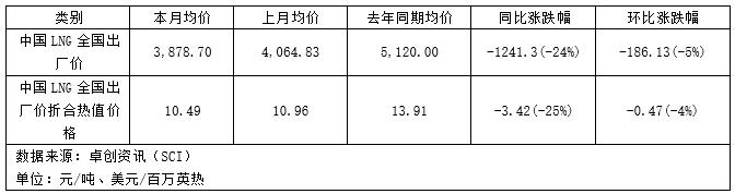 9月中国LNG价格弱势运行,月均价环比小幅下跌。