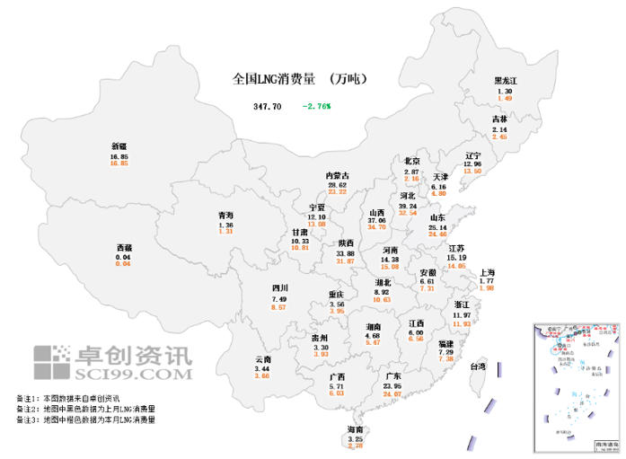 需求方面,9月全国LNG消费量约为347.7万吨,较上月减少2.76%,较去年同期增长4.43%。9月国内LNG消费量环比出现减少,主要是与8月相比少一个自然日。从日均数据来看,9月日均消费量11.59万吨,环比增长0.52%,增量的原因是供暖季前,北方大部分地区继续囤货补库,但因为华北重大活动和华南台风冲击,终端企业开工负荷率受限,虽然LNG日均消费量环比增加,但增幅有限。