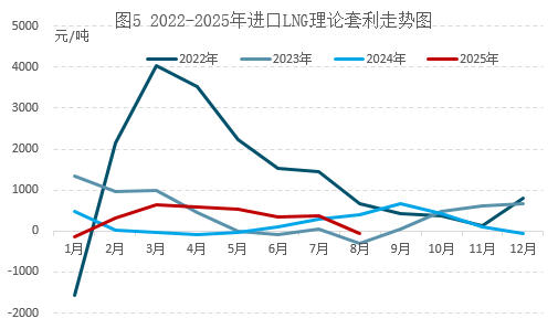 备注:因进口LNG套利计算采用中华人民共和国海关总署发布的进口LNG月度价格计算,该数据滞后一个月,因此图中2025年数据滞后一个月。