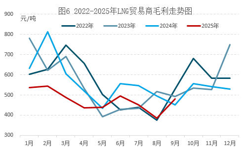 根据卓创资讯统计,9月LNG贸易商的毛利为481元/吨,同比增加29元/吨,环比增加95元/吨。贸易商毛利自去年12月份开始,截至4月皆处于2022年以来最低水平,5月开始有所回升,9月呈略高于去年同期的态势。
