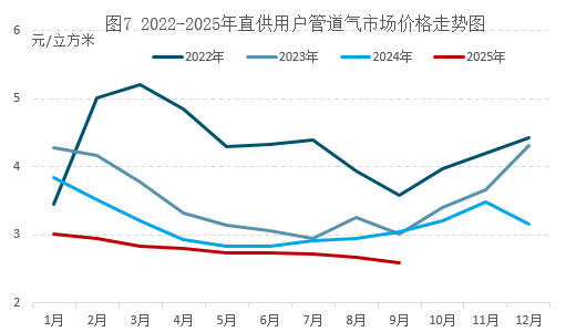 根据卓创资讯统计,9月下游直供用户的用气价格为2.6元/立方米,同比减少0.45元/立方米,环比减少0.07元/立方米。受供需宽松影响,直供用户的用气成本逐年下行,2025年持续处于近四年以来同期最低水平。