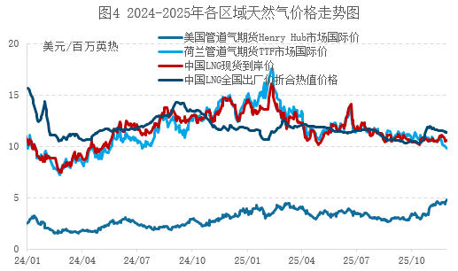 天然气期货月均价实现同环比显着上涨;欧洲市场则因供应充裕、需求温和及地缘情绪缓和,价格震荡下行。进入12月,强劲的出口将继续为美国价格提供托底,预计价格将偏强运行,而欧洲市场则面临温暖天气等多重利空考验,预计价格重心仍存下行压力。