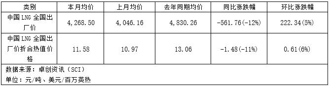 11月中国LNG价格较上月整体上涨,但月内呈逐步下行走势。